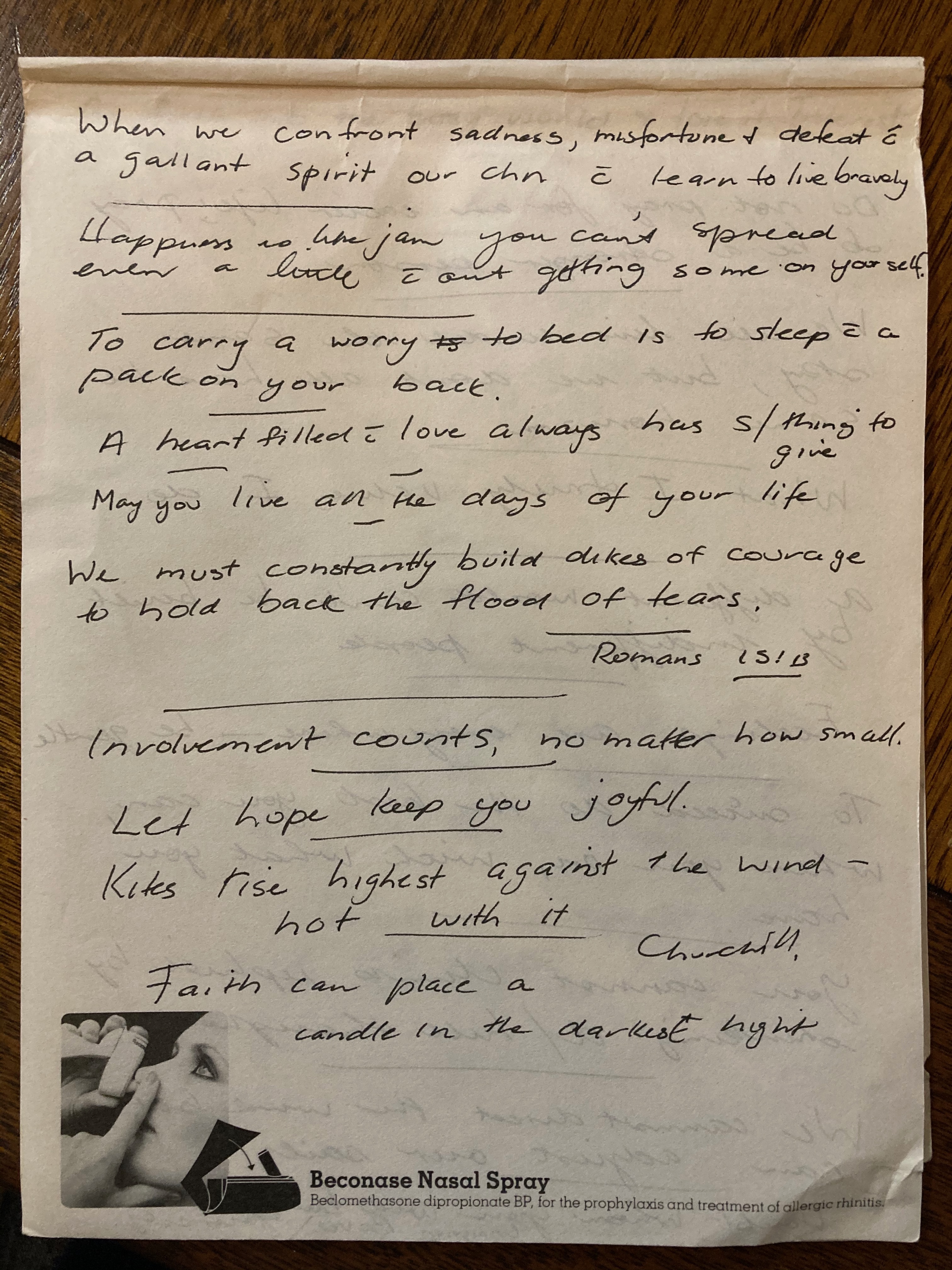 There are several things that I love about this photo. It’s a list of quotes and sayings that Joan collected & compiled. Let me tell you why I love it.